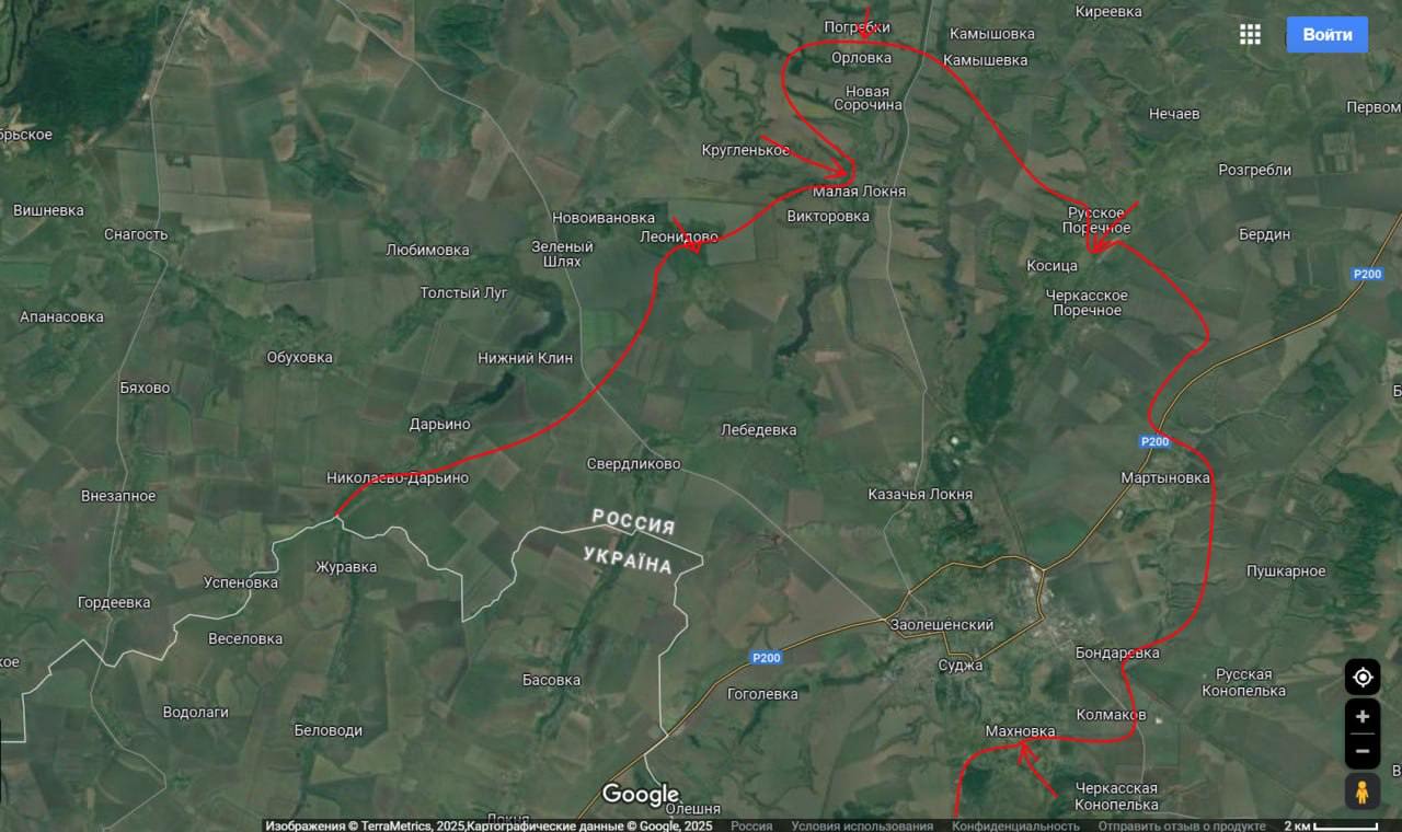 Судя по ней, линия фронта и серая зона сместились до села Бердин к северо-востоку от Суджи примерно на три километра. Но украинского контроля там нет, и территория эта обозначена как оспариваемая.