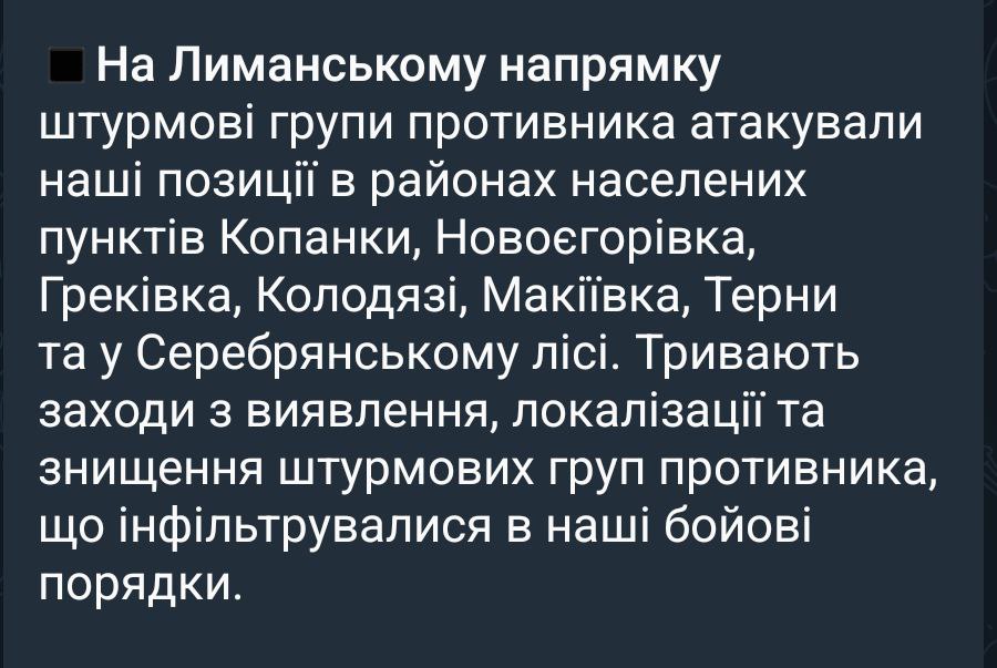 "На Лиманском направлении противник пытается прорываться в н.п. Колодези, зафиксирован огневой контакт с противником на дистанции около 1 км до населенного пункта" - уточняет  офицер с позывным "Алекс".