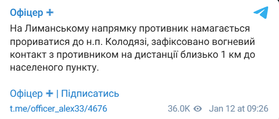 "На Лиманском направлении противник пытается прорываться в н.п. Колодези, зафиксирован огневой контакт с противником на дистанции около 1 км до населенного пункта" - уточняет офицер с позывным "Алекс".