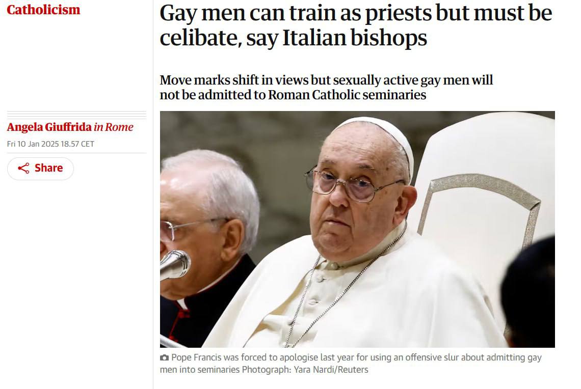 Католическая церковь Италии разрешила открытым геям становиться священниками, но только при условии  соблюдения ими целибата (то есть - безбрачия).