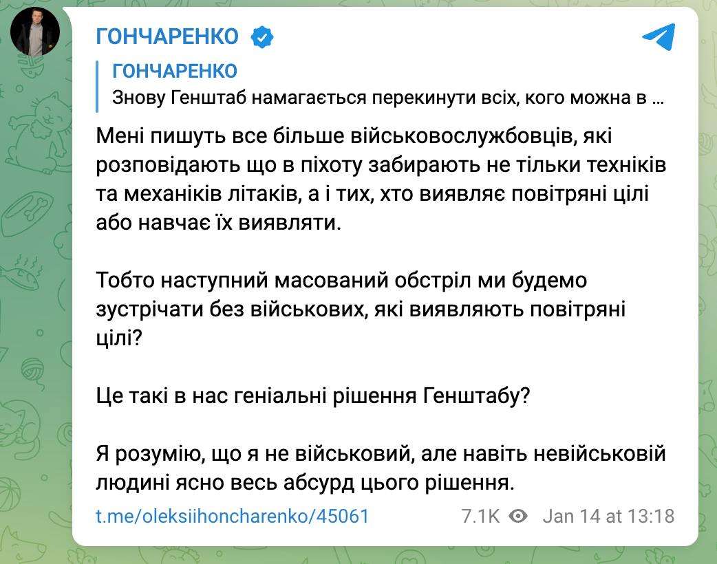 13.26 В пехоту забирают не только техников и механиков самолетов Воздушных сил, но и тех, кто обнаруживает воздушные цели или учит их обнаруживать. Как заявляет нардеп Гончаренко, ему все чаще об этом сообщают военные.
