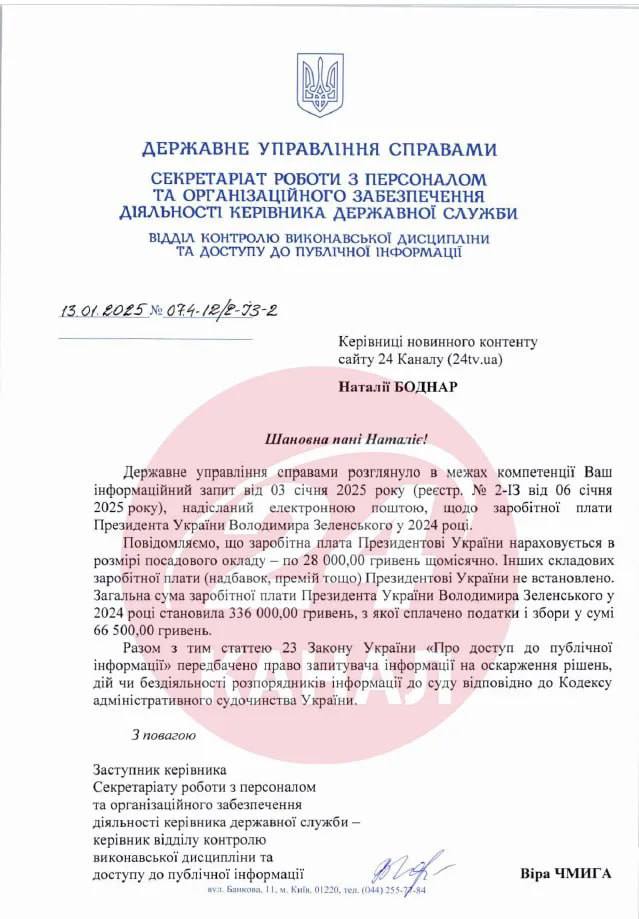 Об этом говорится в ответе Управления государственными делами на запрос издания "24 канал".