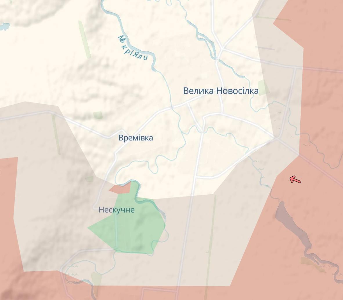Нескучное было освобождено в июне 2023 года в ходе контрнаступления украинских войск на Южном фронте. Теперь около Великой Новоселки остался только один населенный пункт, подконтрольный ВСУ - уже упомянутая Времьевка. Она, судя по карте, уже блокирована с запада.