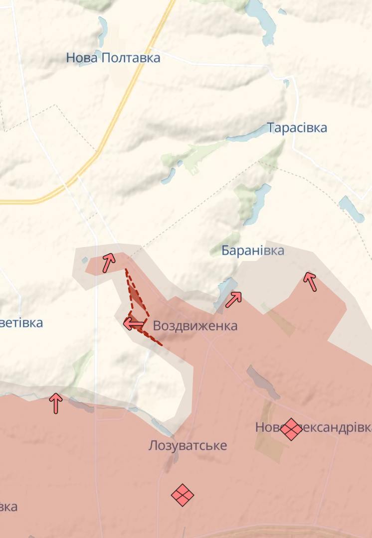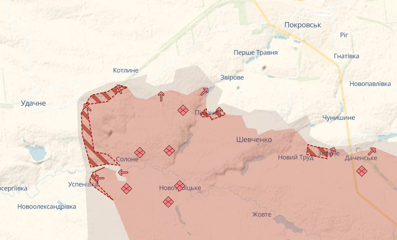 Под Покровском военные РФ снова продвинулись на юге, на запад в направлении Удачного, севернее в направлении Котлиного (дорога между этими сёлами уже перерезана), и восточнее около Воздвиженки в направлении трассы на Константиновку.