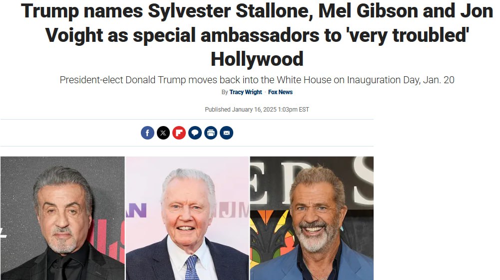 "Для меня большая честь объявить Джона Войта, Мела Гибсона и Сильвестра Сталлоне специальными послами в прекрасном, но очень неспокойном месте - Голливуде, штат Калифорния", - написал Трамп в Truth Social.