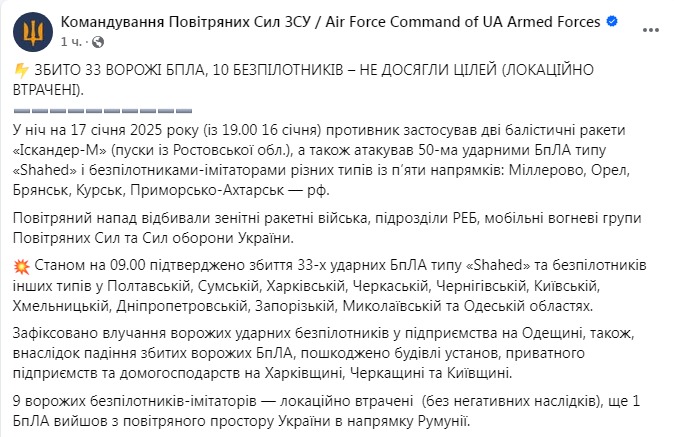 Всего за ночь в Украине были сбиты 33 "Шахеда" из 50 запущенных, еще 10 "не достигли цели".