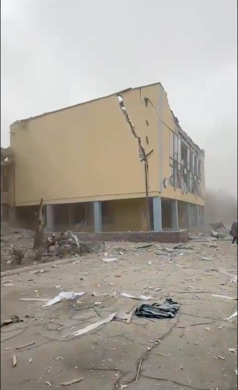 В городе повреждены две пятиэтажки. В одной из них возник пожар. Кроме того, изуродовано и не эксплуатировавшееся здание. Судя по видеокадрам, это колледж Национального авиационного университета.