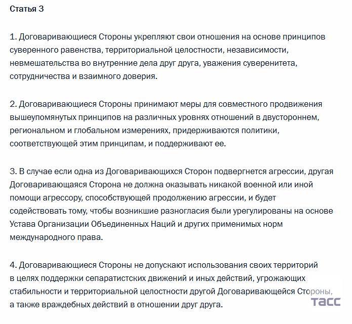 "В случае, если одна из договаривающихся сторон подвергнется агрессии, другая договаривающаяся сторона не должна оказывать никакой военной или иной помощи агрессору, способствующей продолжению агрессии, и будет содействовать тому, чтобы возникшие разногласия были урегулированы на основе Устава Организации Объединенных Наций и других применимых норм международного права", - говорится в документе.