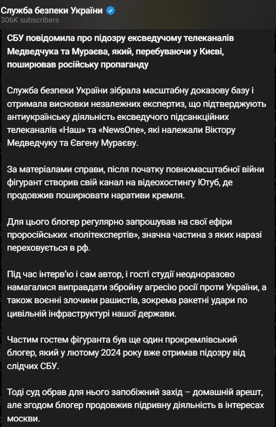 "По материалам дела, после начала полномасштабной войны фигурант создал свой канал на видеохостинге Ютуб, где продолжил распространять нарративы Кремля. Для этого блогер регулярно приглашал на свои эфиры пророссийских "политэкспертов", значительная часть из которых сейчас скрывается в РФ", - говорится в сообщении.