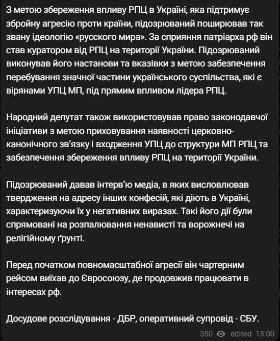 "Подозреваемый давал интервью медиа, в которых высказывал утверждение в адрес других действующих в Украине конфессий, характеризуя их в негативных выражениях", - заявляет Офис генпрокурора.