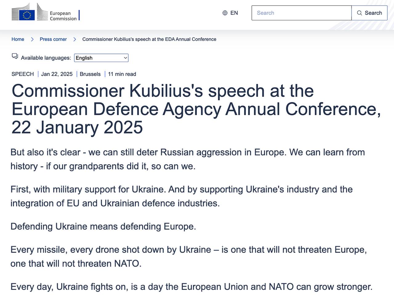 "Мы все еще можем сдерживать российскую агрессию в Европе. Во-первых, с помощью военной поддержки Украины. И с помощью поддержки украинской промышленности и интеграции оборонной промышленности ЕС и Украины. Защищая Украину, мы защищаем Европу. Каждая ракета, каждый беспилотник, сбитый Украиной, — это те, которые не будут угрожать Европе, те, которые не будут угрожать НАТО. Каждый день, пока Украина продолжает бороться, - это день, когда Европейский союз и НАТО могут стать сильнее", - заявил Кубилюс.