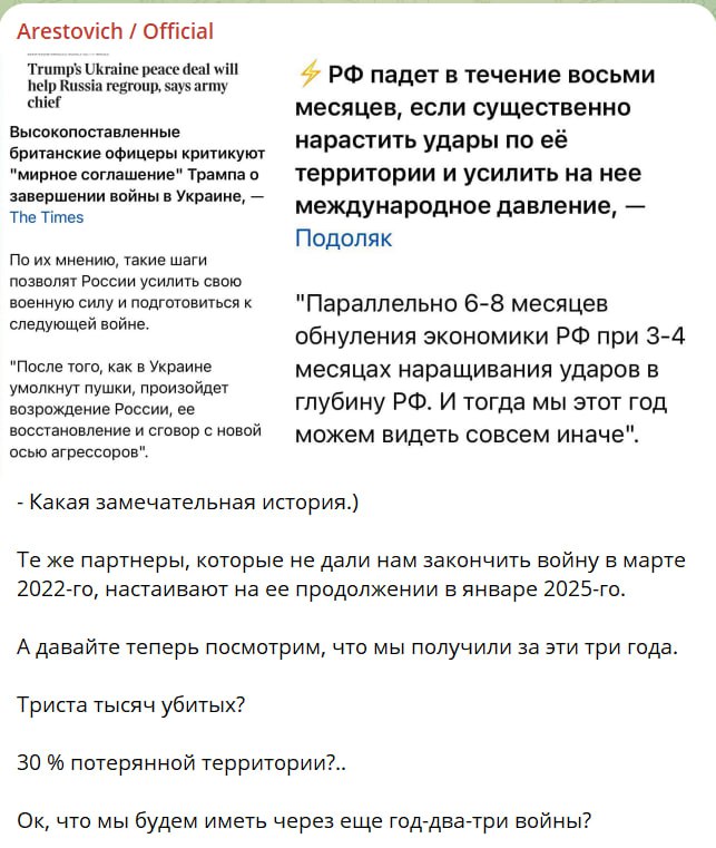Бывший советник Офиса президента Алексей Арестович заявил, что "те же партнеры, которые не дали нам закончить войну в марте 2022-го, настаивают на ее продолжении в январе 2025-го".