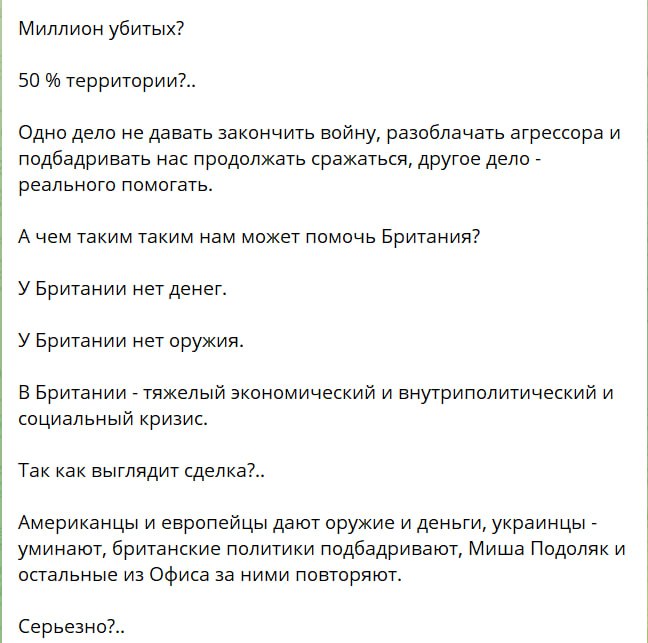 "Одно дело не давать закончить войну и подбадривать нас продолжать сражаться, другое дело - реального помогать. А чем нам может помочь Британия? У Британии нет денег. У Британии нет оружия. В Британии тяжелый экономический и внутриполитический, и социальный кризис. Так как выглядит сделка? Американцы и европейцы дают оружие и деньги, украинцы - умирают, британские политики подбадривают, Миша Подоляк и остальные из Офиса за ними повторяют", - добавил экс-советник Банковой.