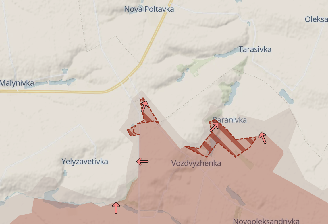 Кроме того, россияне в районе Воздвиженки и Барановки (к востоку от Мирнограда) почти перерезали трассу Покровск - Константиновка - до нее осталось менее километра.