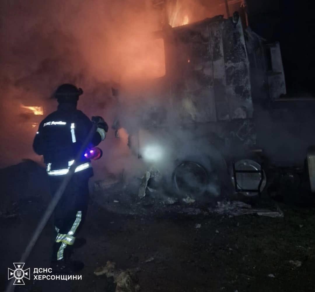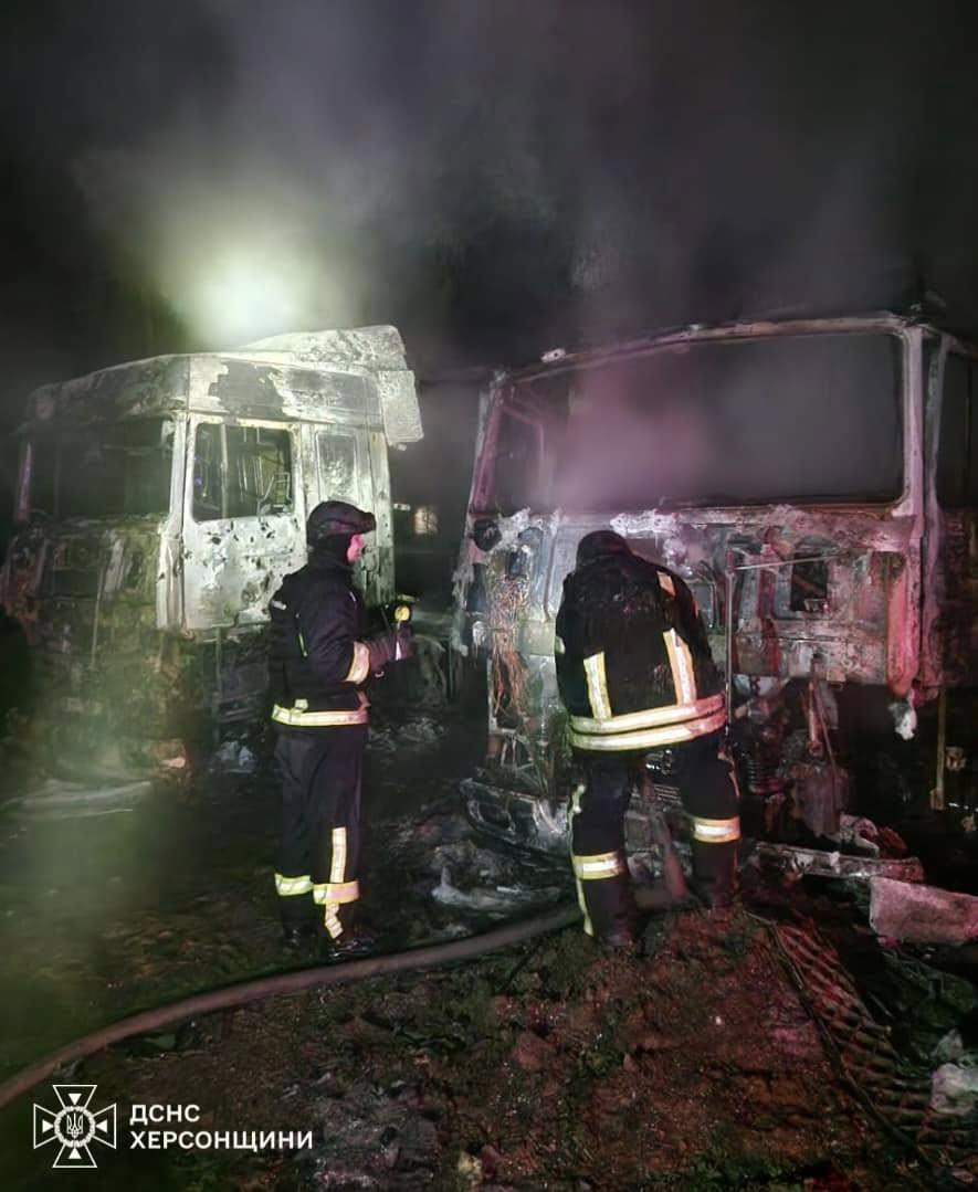 10:39 В пригороде Херсона ночью от обстрела загорелись три фуры, сообщает ГСЧС.