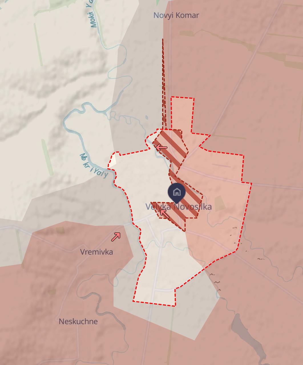 Также в серой зоне находятся северо-западные окраины населенного пункта, через которые снабжалась Великая Новоселка.