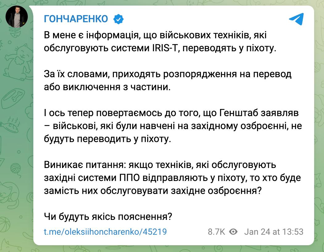 14:06 Военных техников, обслуживающих западные системы ПВО IRIS-Т, начали переводить в пехоту, заявляет нардеп Алексей Гончаренко, ссылаясь на обращения самих военных.