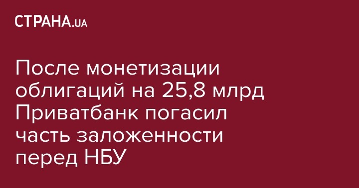 Национальный банк Украины в рамках оздоровления ПАО КБ "Приватбанк" монетизировал облигации внутреннего государственного займа на сумму в 25,8 млрд гривен.