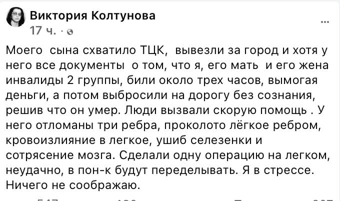 "Моего сына схватило ТЦК, вывезли за город и хотя у него все документы о том, что я, его мать и его жена инвалиды 2-й группы, били около трех часов, вымогая деньги, а потом выбросили на дорогу без сознания, решив что он умер. Люди вызвали скорую помощь. У него отломаны три ребра, проколото лёгкое ребром, кровоизлияние в легкое, ушиб селезенки и сотрясение мозга. Сделали одну операцию на легком, неудачно, в понедельник будут переделывать. Я в стрессе. Ничего не соображаю", - написала Колтунова.