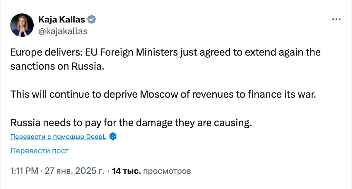 "Европа справляется: министры иностранных дел ЕС только что согласились снова продлить санкции против России. Это продолжит лишать Москву доходов для финансирования ее войны. Россия должна заплатить за ущерб, который она наносит", - написала чиновница.