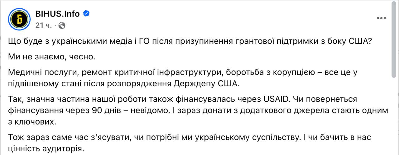 "Агентство (USAID) покрывало значительную часть и нашей деятельности. Поэтому сейчас роль донатов от зрителей меняется с альтернативного источника на один из ключевых. Что будет через 90 дней, нам неизвестно, однако знаем одно: сейчас самое время выяснить, действительно ли наша работа нужна украинскому обществу", - отметили в редакции Bihus.Info.