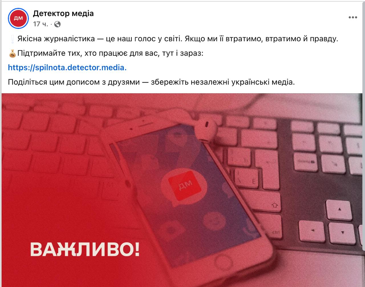 "Качественная журналистика — это наш голос в мире. Если мы его потеряем, потеряем и правду. Поддержите тех, кто работает для вас, здесь и сейчас", - попросил вчера на своей Фейсбук-странице проект "Детектор медиа", который большую часть своих средств официально получает от источников, финансируемых USAID.