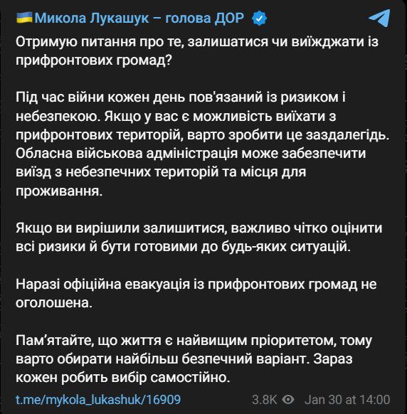 "Если у вас есть возможность уехать из прифронтовых территорий, следует сделать это заранее. Пока официальная эвакуация из прифронтовых общин не объявлена", - написал Лукашук.