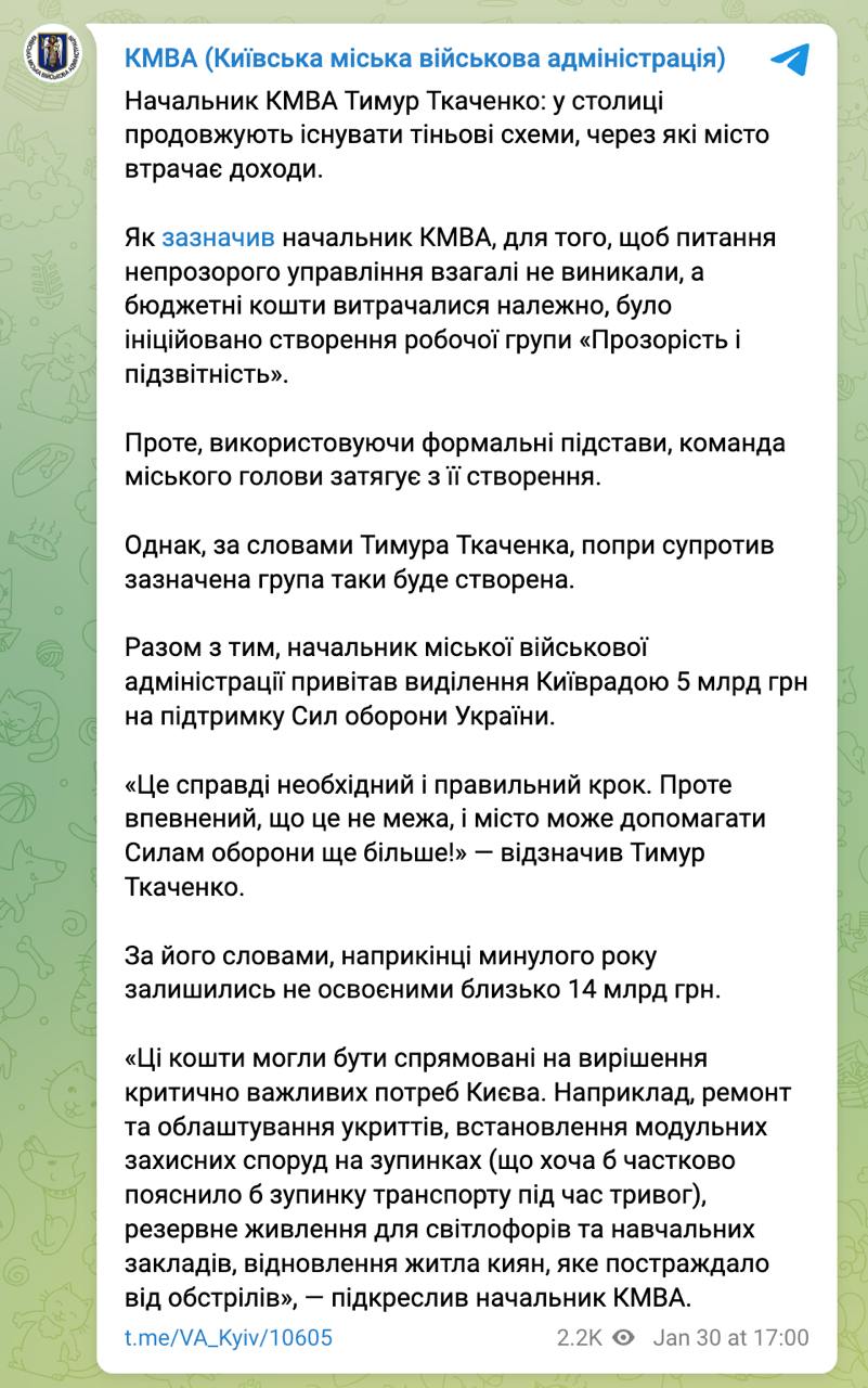 Как заявил Ткаченко, для того чтобы вопрос непрозрачного управления вообще не возникал, а бюджетные средства тратились должным образом, было инициировано создание рабочей группы "Прозрачность и подотчетность". Однако команда мэра Виталия Кличко затягивает ее создание, "используя формальные основания".