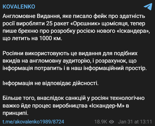 Также Коваленко отмечает, что из-за санкций у россиян технологически тяжело идет процесс производства "Искандер-М".
