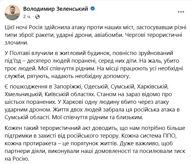 "В Полтаве попали в жилой дом, полностью разрушен подъезд – десять человек ранены, среди них дети. К сожалению, убиты три человека. На месте работают все необходимые службы, спасают, оказывают необходимую помощь", - написал он.