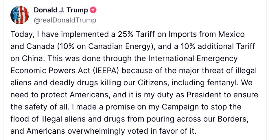 Президент США Дональд Трамп издал указ о введении с 4 февраля 25%-х пошлин на импорт из Мексики и Канады (с исключением для канадских энергоносителей, тариф по которым будет 10%). Также 10%-ю пошлину ввели на товары из Китая.