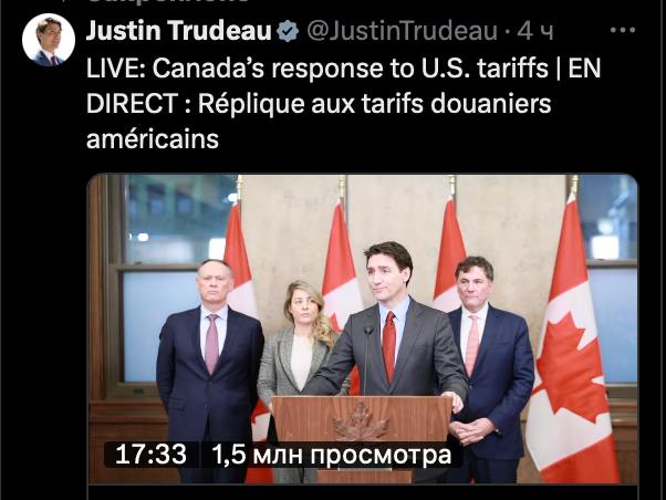 Канада вводит 25%-е тарифы для товаров на общую сумму 106 млрд долларов США, заявил премьер-министр Джастин Трюдо. Он также призвал соотечественников покупать канадские товары и проводить отпуск на родине, а не в США.
