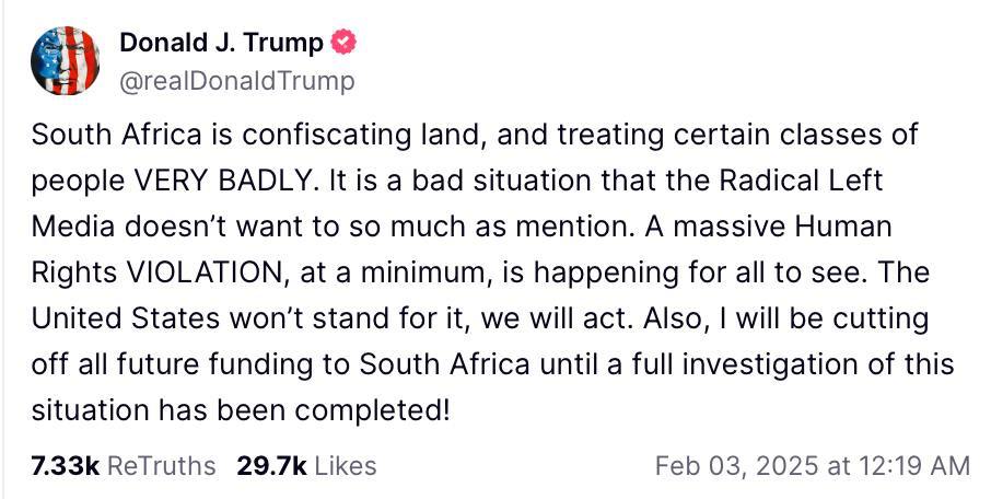 Он анонсировал, что прекратит "всё дальнейшее финансирование Южной Африки до завершения полного расследования этой ситуации".