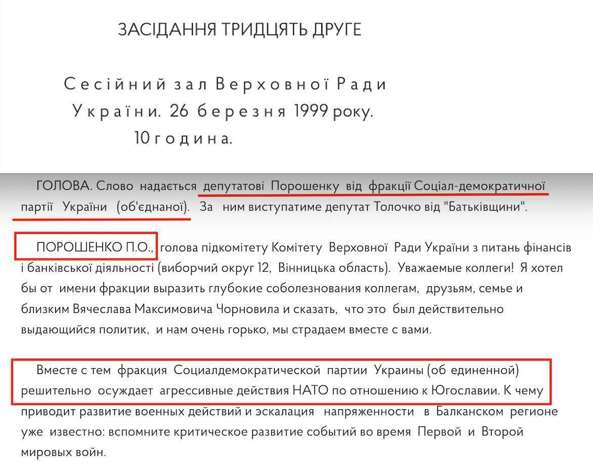 "Фракция Социал-демократической партии решительно осуждает агрессивные действия НАТО по отношению к Югославии! К чему приводит развитие военных действий и эскалация напряженности в Балканском регионе, уже известно: вспомните критическое развитие событий во время Первой и Второй мировых войн", - заявил тогда Порошенко, причем на русском языке.