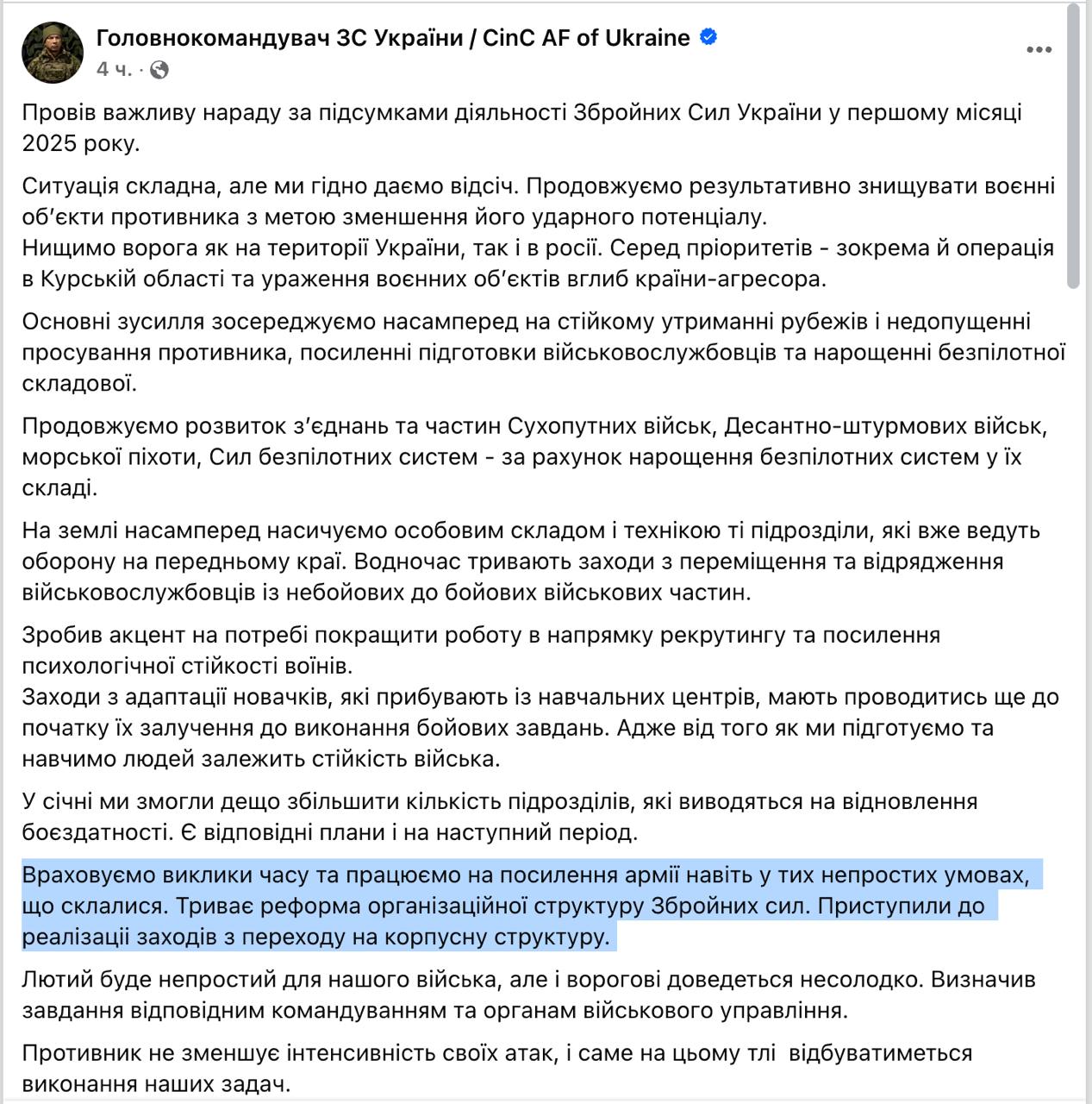 "Учитываем вызовы времени и работаем на усиление армии даже в сложившихся непростых условиях. Продолжается реформа организационной структуры Вооруженных сил. Приступили к реализации мер по переходу на корпусную структуру", - написал главком в Фейсбуке.