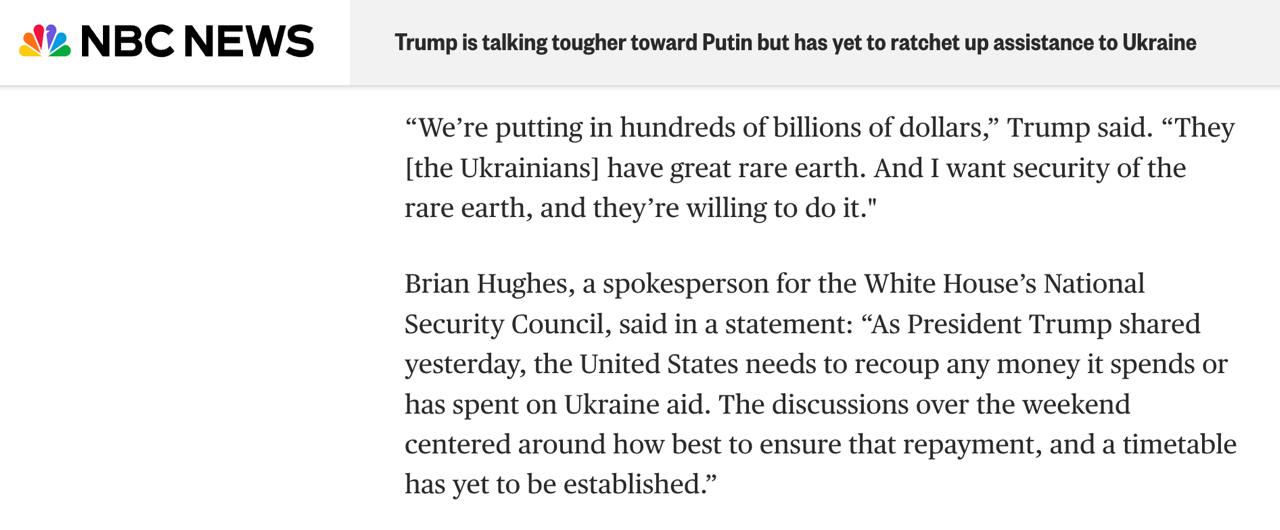 "Как вчера заявил президент Трамп, Соединенным Штатам необходимо возместить любые деньги, которые они тратят или тратили на помощь Украине. Обсуждения в выходные были сосредоточены на том, как лучше всего обеспечить это погашение, и график еще не установлен", - сказал Хьюз.