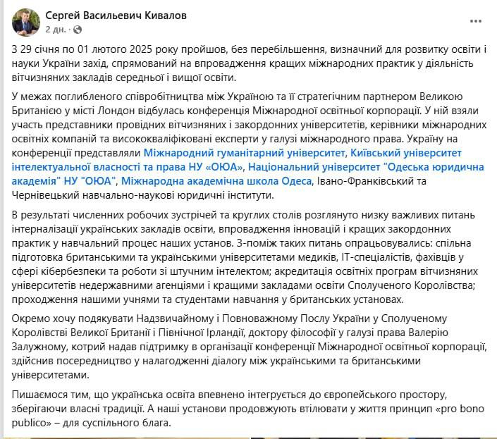 Он сообщил, что в Лондоне прошла конференция Международной образовательной корпорации, которая "стала важным шагом в развитии образования и науки Украины", причем "особую роль в организации мероприятия сыграл посол Украины в Великобритании Валерий Залужный".