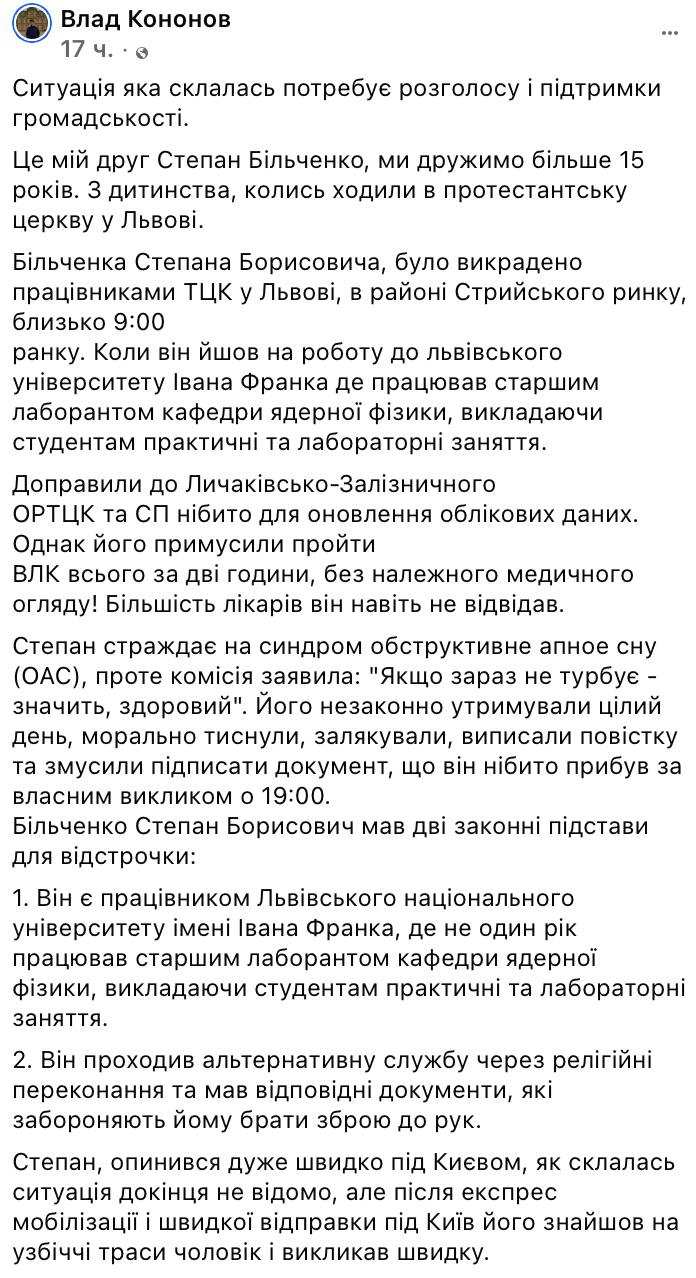 "Бильченко Степан Борисович был похищен сотрудниками ТЦК во Львове, в районе Стрыйского рынка, около 9:00 утра. В этот момент он направлялся на работу во Львовский университет имени Ивана Франко, где работал старшим лаборантом кафедры ядерной физики, проводя для студентов практические и лабораторные занятия.