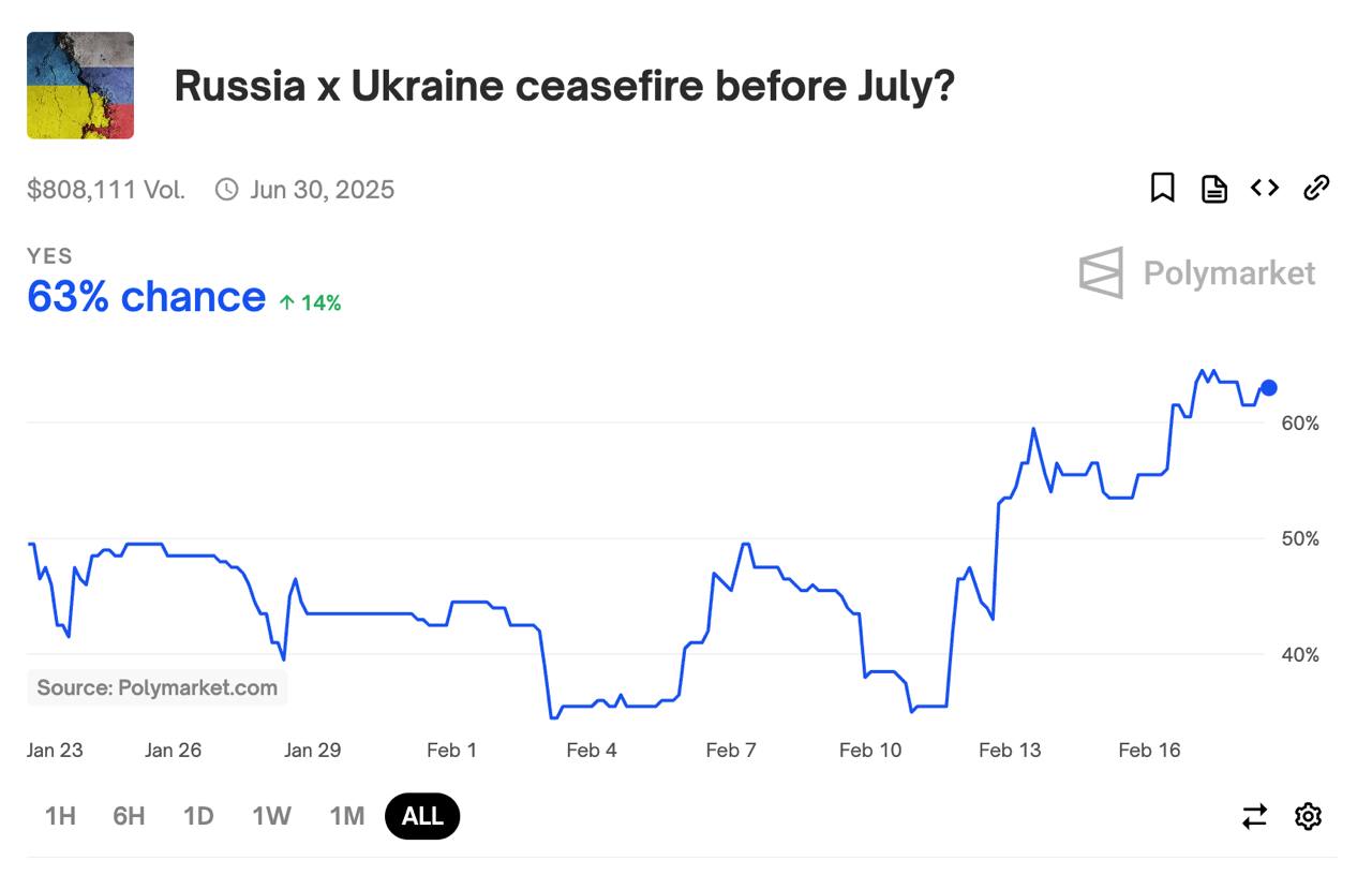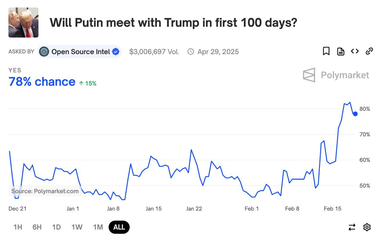 11.01 Ставки на прекращения войны в Украине в этом году на букмекерской платформе Polymarket выросли до 63%, а на встречу Путина и Трампа в ближайшие два месяца - до 78%.