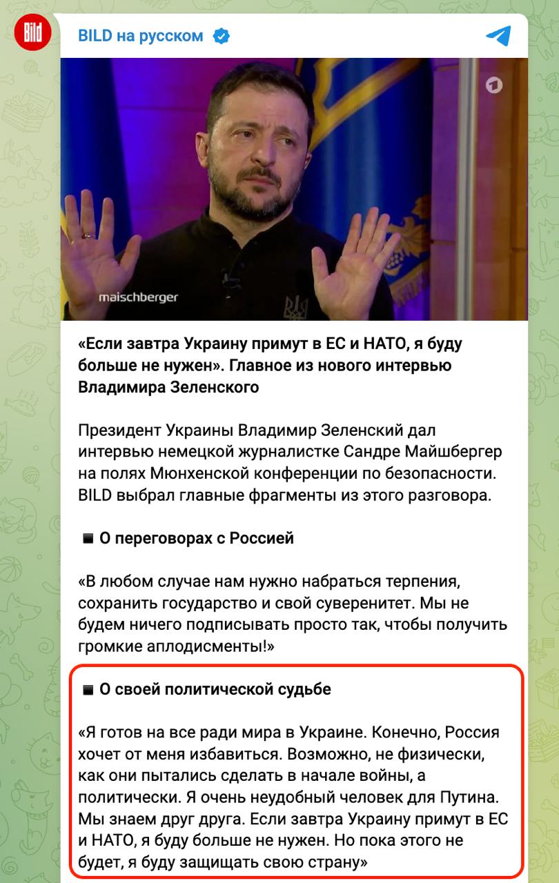 "Я готов на все ради мира в Украине. Конечно, Россия хочет от меня избавиться. Возможно, не физически, как они пытались сделать в начале войны, а политически. Я очень неудобный человек для Путина. Мы знаем друг друга. Если завтра Украину примут в ЕС и НАТО, я буду больше не нужен. Но пока этого не будет, я буду защищать свою страну", - сказал Зеленский.