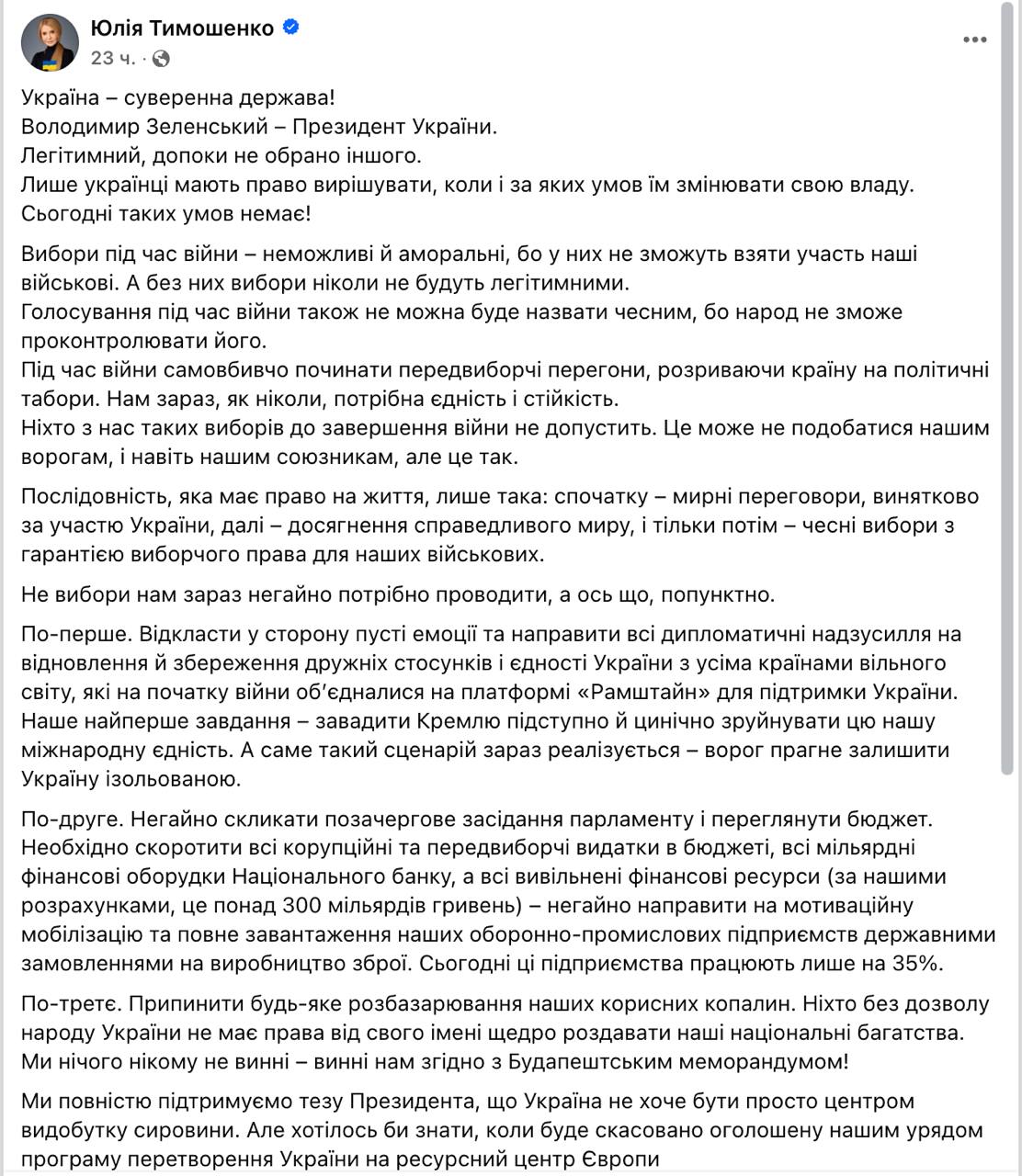 "Владимир Зеленский - президент Украины. Легитимный, пока не избран другой. Только украинцы имеют право решать, когда и при каких условиях им менять свою власть. Сегодня таких условий нет!" - написала Тимошенко.
