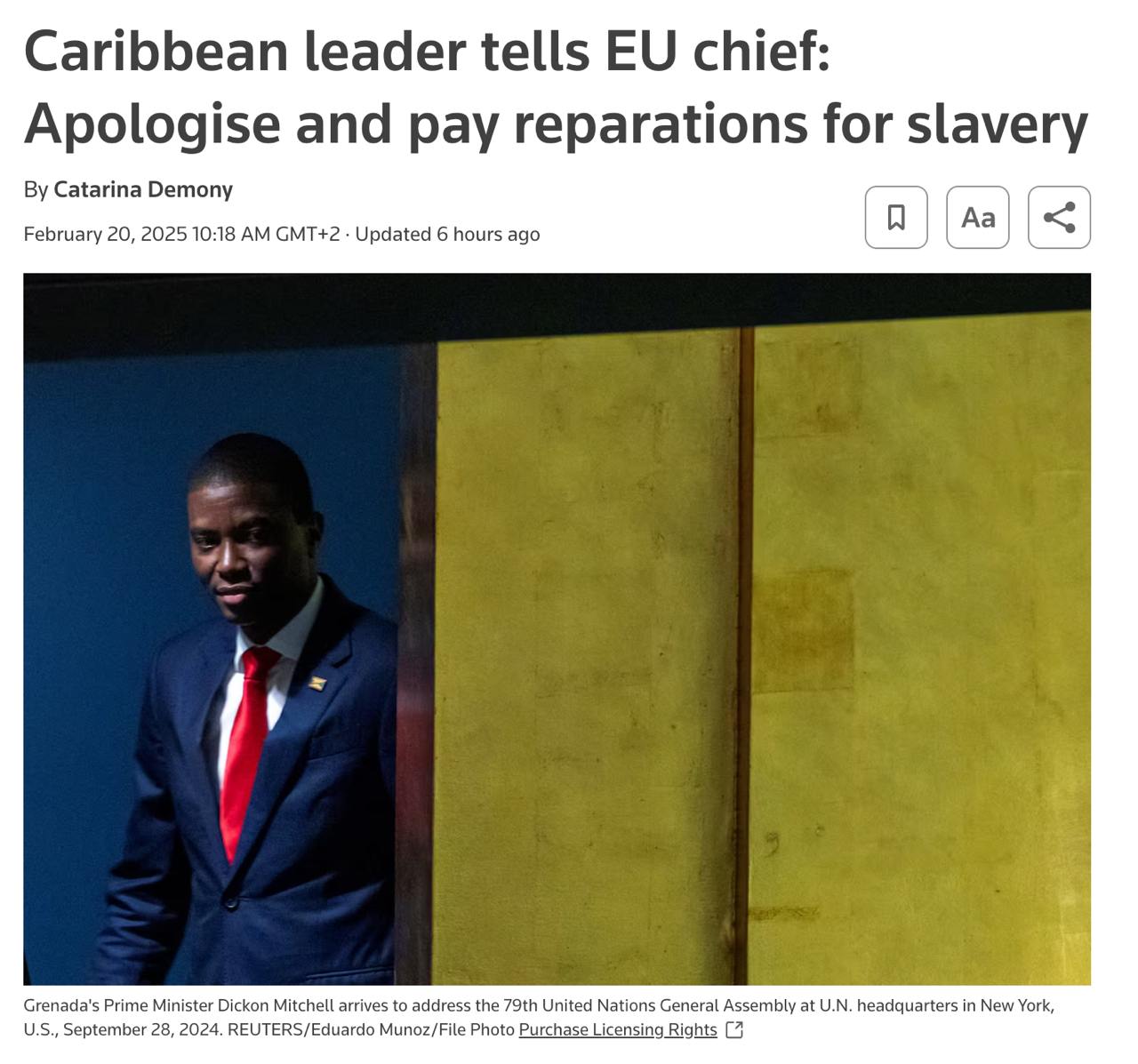 Лидер стран Карибского бассейна и премьер-министр Гренады Дикон Митчелл обратился к главе Еврокомиссии Урсуле фон дер Ляйен с призывом извиниться и выплатить репарации за рабство.