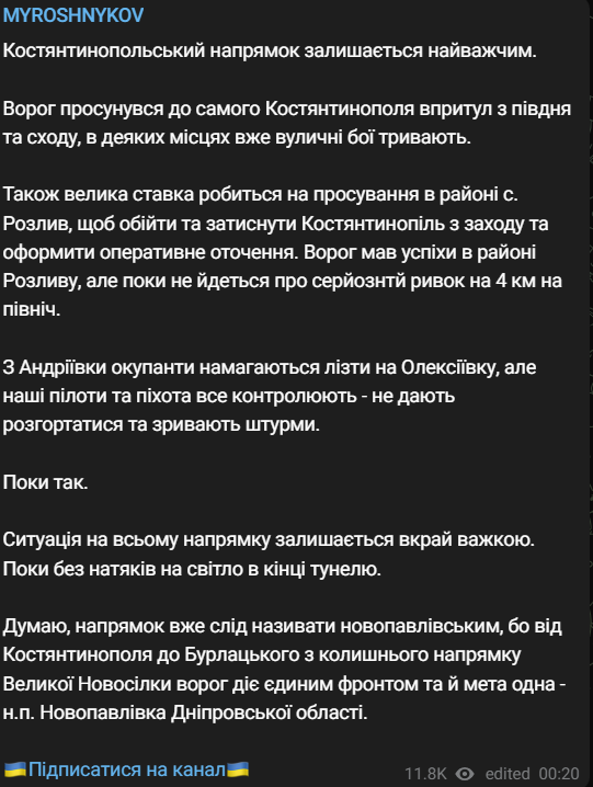 "От Константинополя до Бурлацкого из бывшего направления Великой Новоселки враг действует единым фронтом и цель одна - н.п. Новопавловка Днепровской области", - заявил обозреватель.