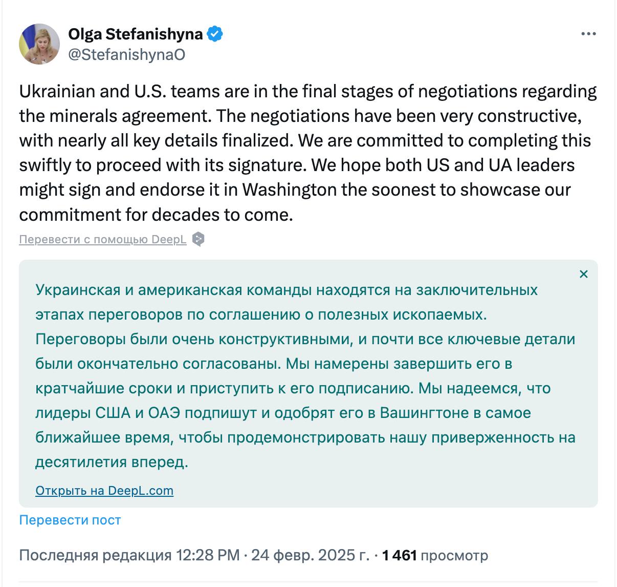 "Переговоры были очень конструктивными, и почти все ключевые детали были окончательно согласованы. Мы намерены завершить его в кратчайшие сроки и приступить к его подписанию", - написала она в Х.