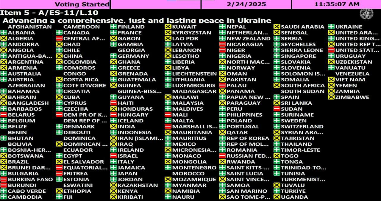 Вашингтон отказался быть соавтором этого проекта и предложил свой, нейтральный. Как сообщали медиа, в нем "действия Украины приравниваются к действиям России". Также в ней говорится о трагической утрате "жизней в российско-украинском конфликте" и содержится призыв скорее прекратить конфликт и установить прочный мир между Украиной и Россией. Между прочим, Москва внесла поправку к американскому проекту резолюции с призывом "устранения коренных причин" кризиса. Госсекретарь США Марко Рубио называл соответствующий проект историческим.