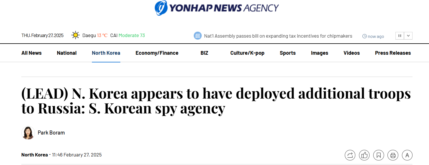 Yonhap News пишет, что оценка последовала за новостным сообщением о том, что в период с января по февраль в ходе второго раунда переброски войск в Курск было переброшено от 1000 до 3000 северокорейских военнослужащих на российских грузовых судах и военных самолетах.
