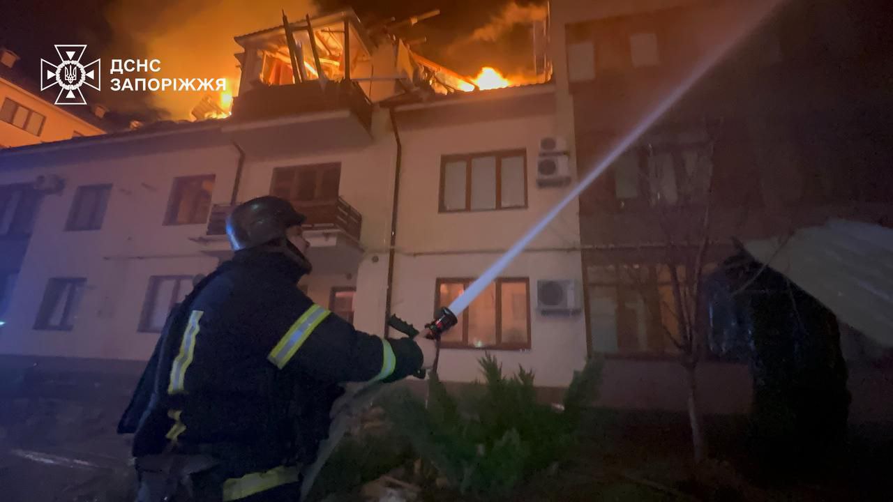 20:15 Еще кадры горящего дома в Запорожье после атаки беспилотников.
