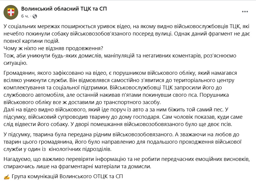 Также в сообщении ТЦК говорится, что собаку затем военкомы отвели к родственникам мужчины. Но на видео видно, что ее просто оставили на улице и она побежала за бусиком, куда "запаковали" ее хозяина.