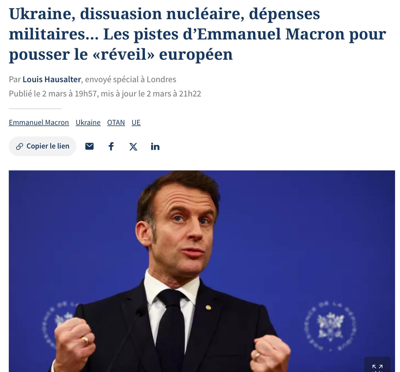 "В ближайшие недели европейских войск на территории Украины не будет. Вопрос в том, как использовать это время, чтобы достичь доступного перемирия, на переговоры по которому уйдут несколько недель, а затем, после подписания мира, последует развертывание сил", - сообщил Макрон.