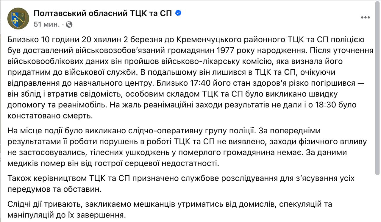 "По предварительным результатам работы, нарушений в работе ТЦК и СП не выявлено, меры физического воздействия не применялись, телесных повреждений у умершего гражданина нет. По данным медиков, умер он от острой сердечной недостаточности", - сообщает ТЦК.